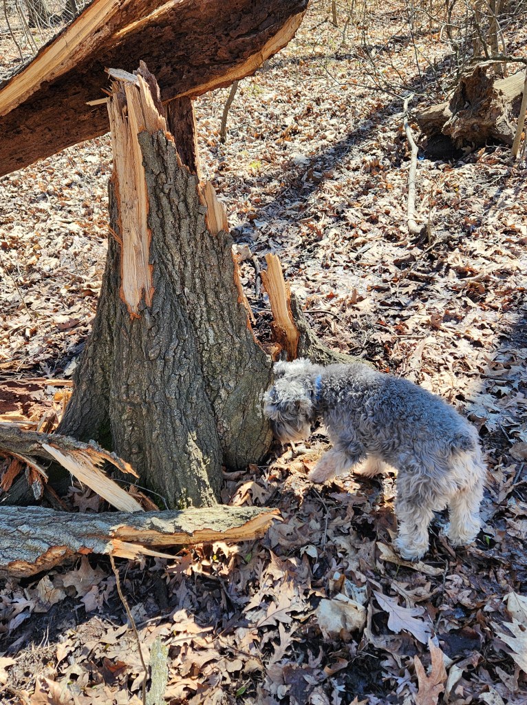 …Ezra examining, foraging around….looking for reasons, why is this tree is down…..she’s flummoxed and perplexed, wondering what will happen next…
